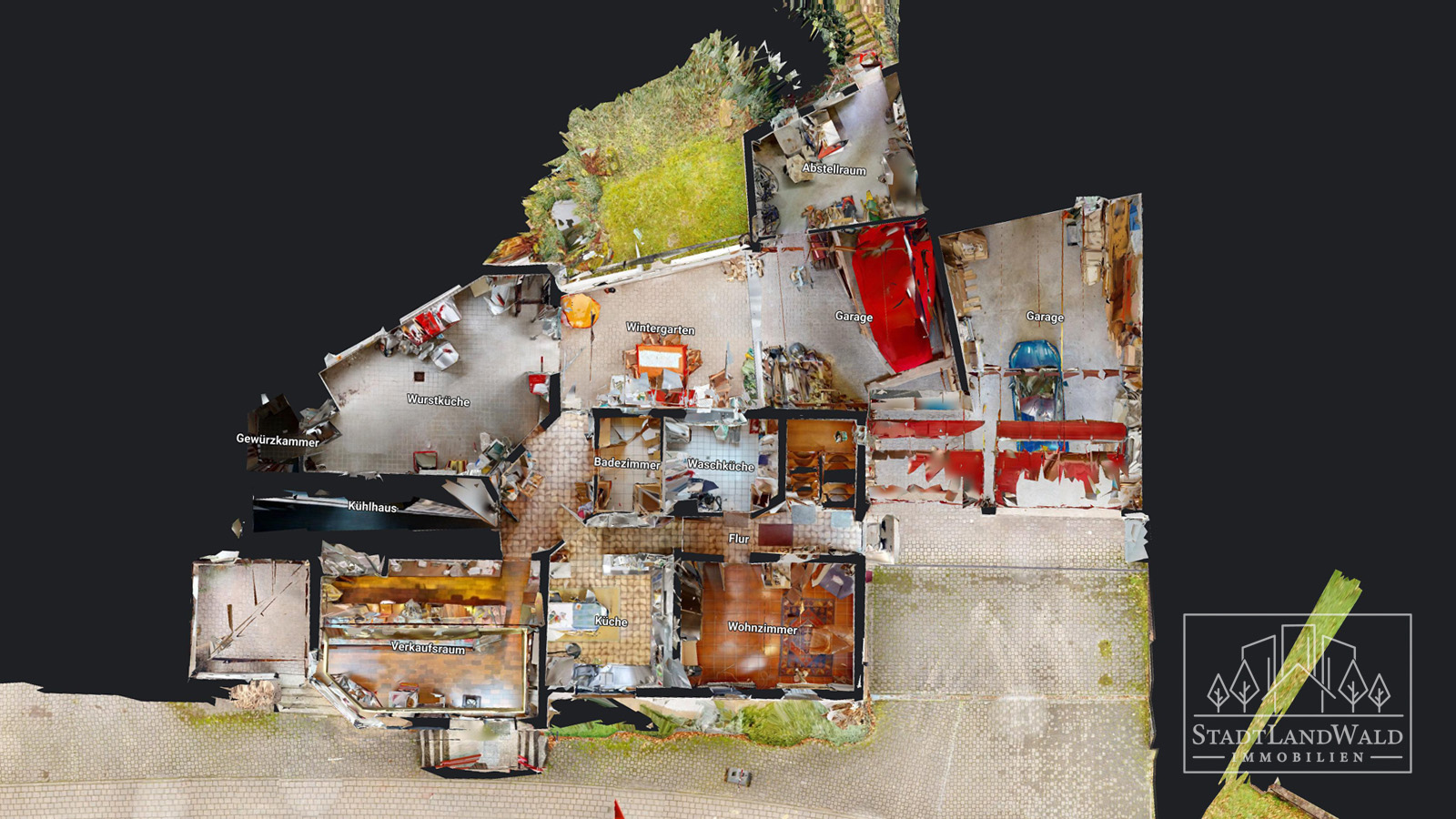 Die Immobilie bietet insgesamt ca. 372m² WOHN- und GEWERBEFLÄCHE. Die Wohnfläche im Obergeschoss beträgt ca. 177m². Im Erdgeschoss und Untergeschoss stehen ca. 195m² Gewerbefläche bereit, mit einer Edelstahlküche, Kühlraum, Verkaufsgeschäft, Lager und weiteren Räumen. Neben der noch vorhandenen Gewerbeausstattung (Ladeneinrichtung, Wurstküche usw.) ist auch der Einbauschrank im Flur sowie die Einbauküche im Obergeschoss im Preis inbegriffen. Die zwei großen Garagen mit elektrischem Torantrieb und ein weiterer Abstellraum bieten noch mehr Platz und Möglichkeiten.