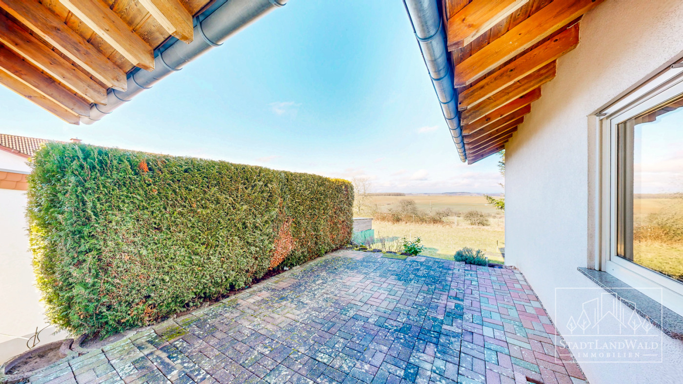 Der pflegeleichte kompakte Garten bietet Ihnen eine unkomplizierte Möglichkeit, die Natur direkt vor der Haustür zu genießen. Der erhöht liegende Terrassenbereich geht nahtlos in das Wohnzimmer über und schafft eine offene, einladende Atmosphäre. Von hier aus haben Sie einen fantastischen Blick in die "Pfälzer Prärie", eine weitläufige, naturnahe Landschaft, die zu jeder Jahreszeit ihren eigenen Charme entfaltet. Ob beim morgendlichen Kaffee oder einem entspannten Abend mit Familie und Freunden – dieser Ausblick macht jeden Moment besonders.