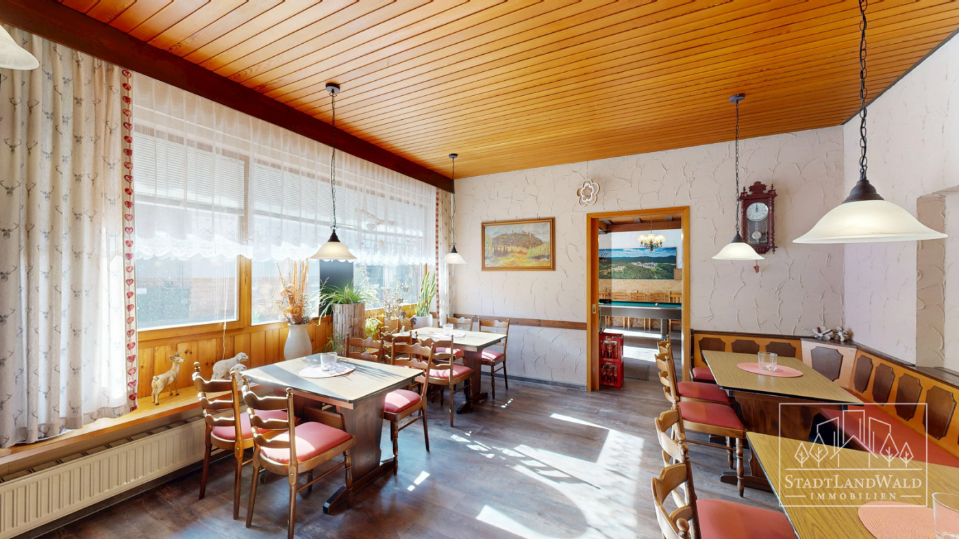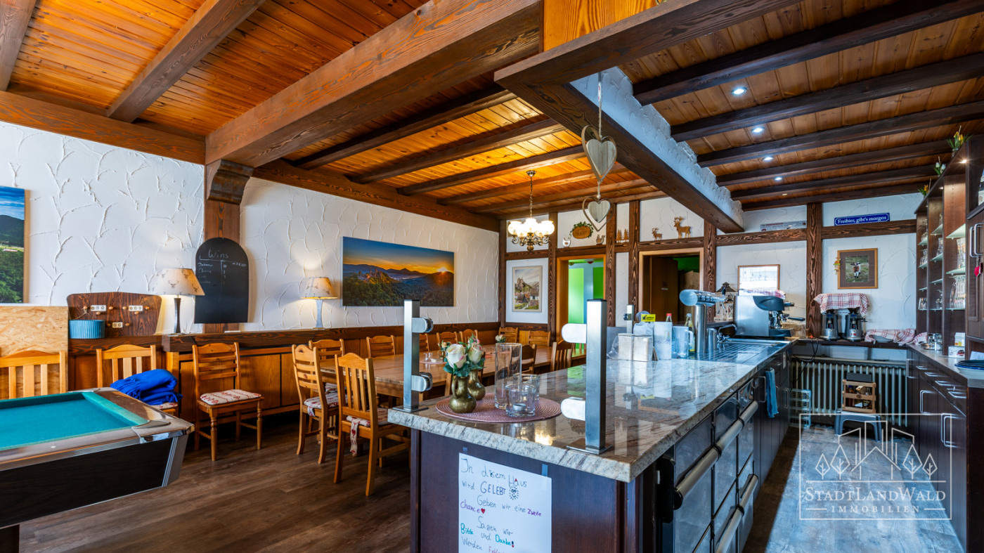 Pension mit Ferienwohnung, Gaststätte & vermietetem Fachwerkhaus | ca. 649m² Wohn- und Nutzfläche | ca. 276m² Wohnfläche | ca. 373m² Nutzfläche | Grundstück ca. 1.920m² | Baujahre: 1754 | 1907 | 1964 | Gastronomiekonzession aktiv | großer Garten mit Bachlauf | Scheune aus Sandstein | zentrale Lage in ERFWEILER