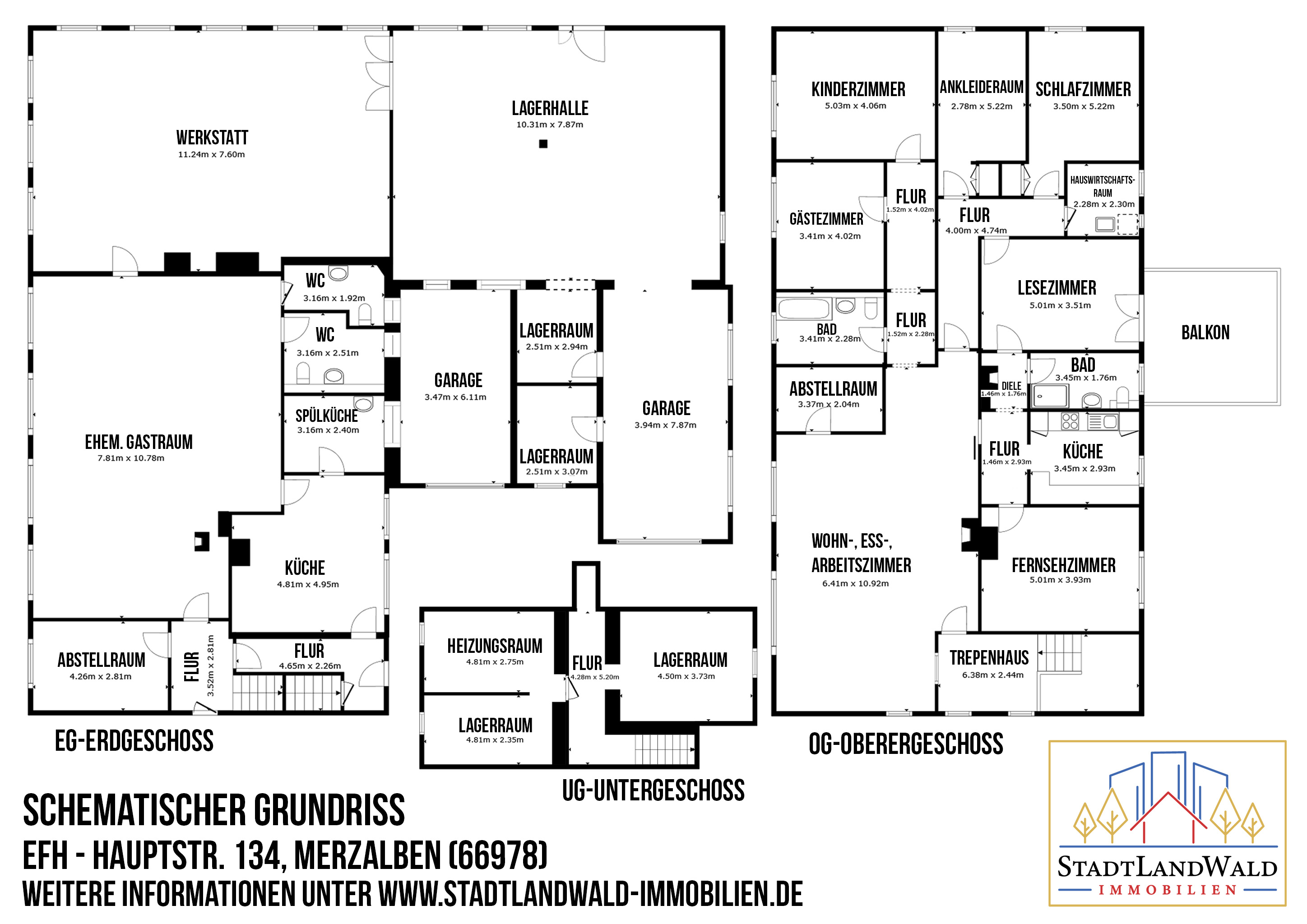 Mit einer WOHN- und NUTZFLÄCHE von ca. 644 m² bietet die Immobilie viel Potenzial. Die Wohnung im OG (ca. 220 m²) verfügt über 9 Zimmer, 2 Bäder und Küche. Im EG befinden sich ca. 375 m² mit ehemaligen Gewerberäumen und zwei Garagen. Zusätzlich bietet das UG ca. 49 m² Nutzfläche. Ideal für Wohnen, Arbeiten, Hobbys oder zusätzliche Lagerbedarfe.
