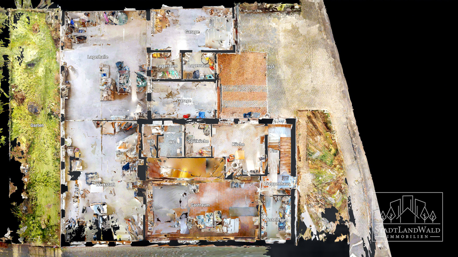 ehemalige Gaststätte (nicht mehr in Betrieb) | Schreinerei | mehrere Lagerräume | 2 integrierte Garagen | Zugang zum Garten