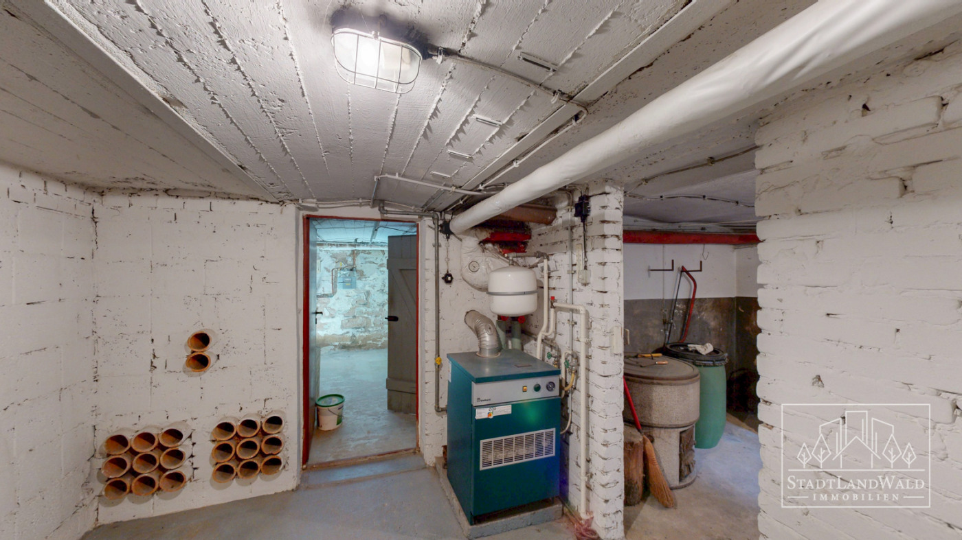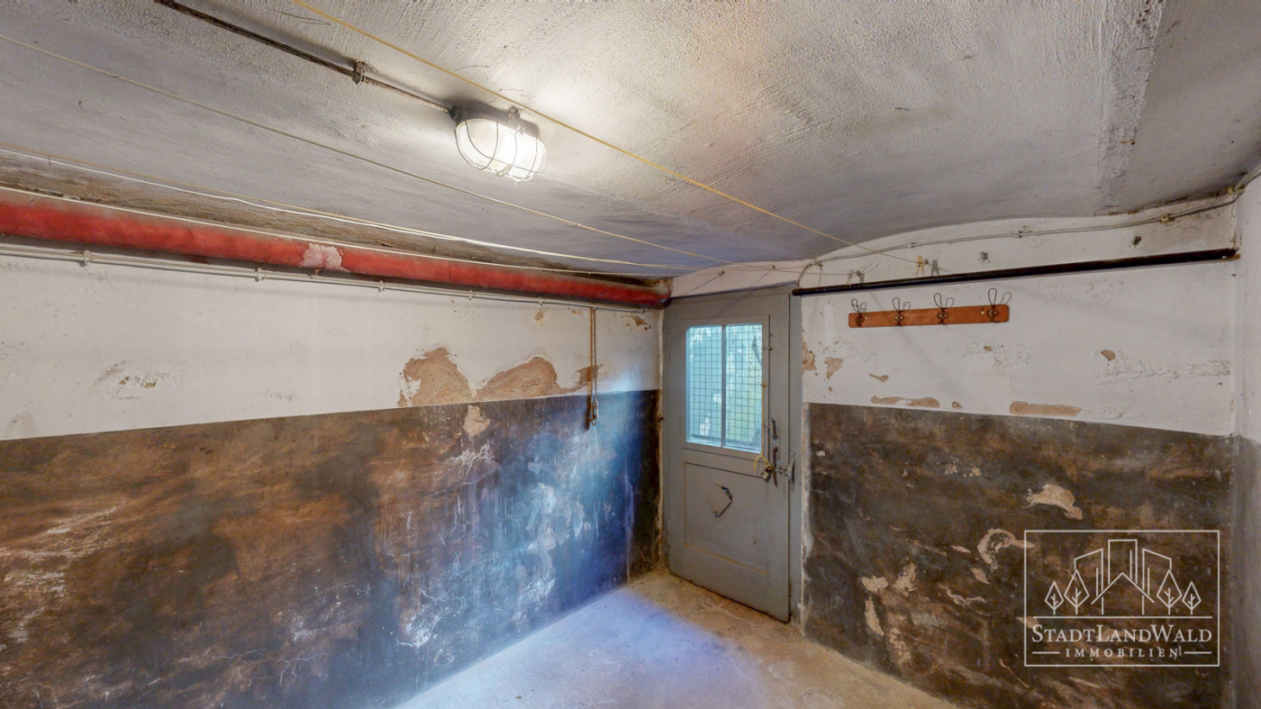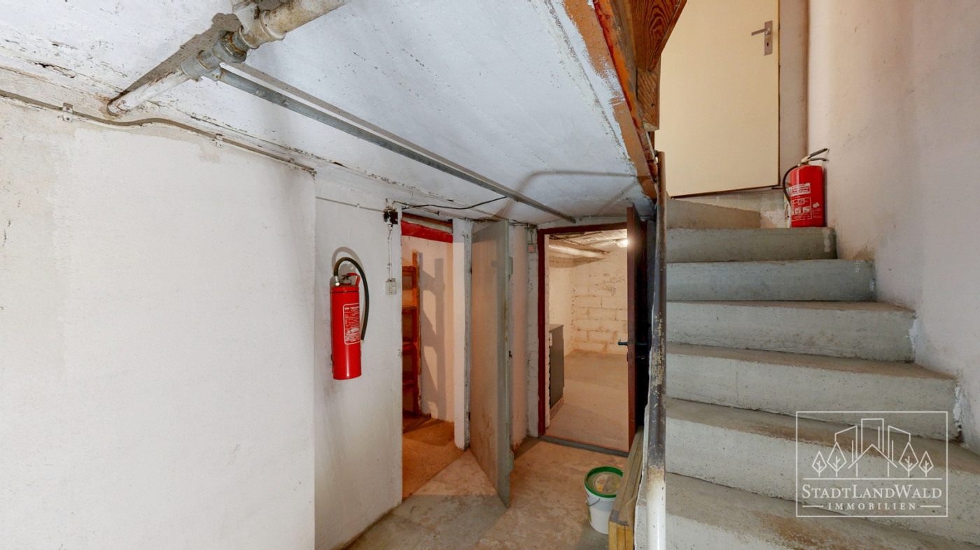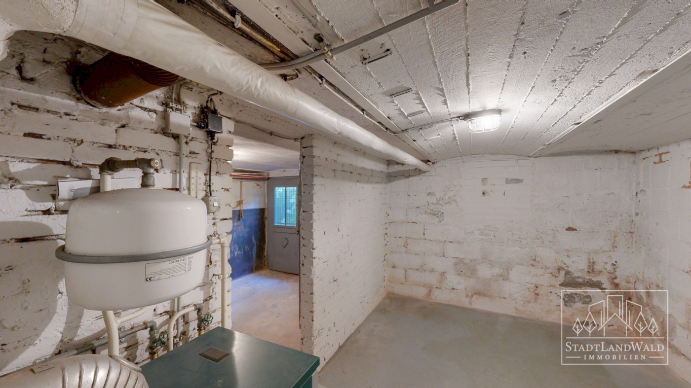 Treppe mit Flur mit Gashausanschluss inkl. Zähler und Hausstrom- und Wasseranschluss | Lagerraum | Heizungsraum | Lagerraum/Werkstatt mit Tür zum Garten.