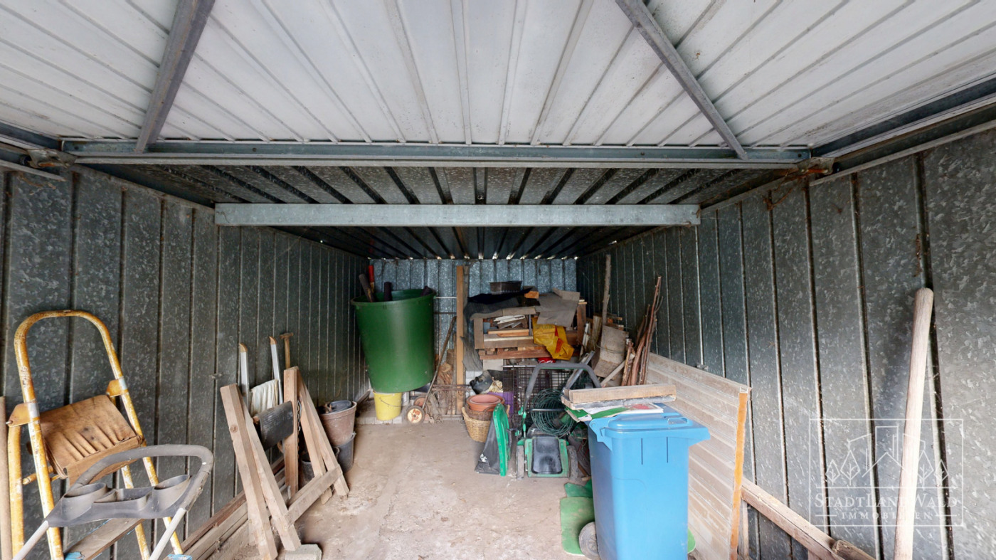 Eine freistehende Garage befindet sich am Ende des Grundstücks und ist bequem über den eigenen Garten oder einen seitlichen Weg erreichbar – ideal für Hobbybastler oder als geschützter Stellplatz.