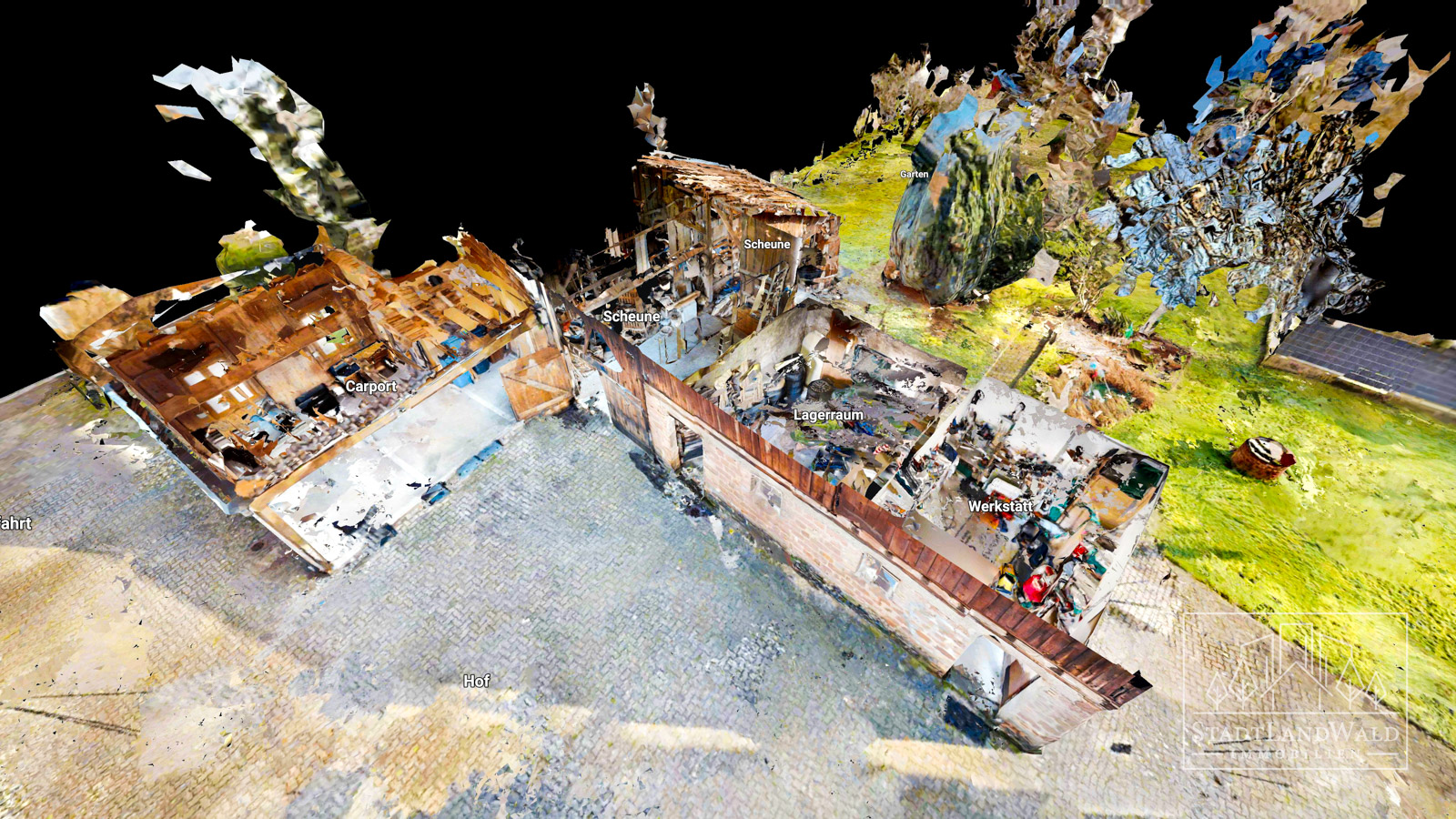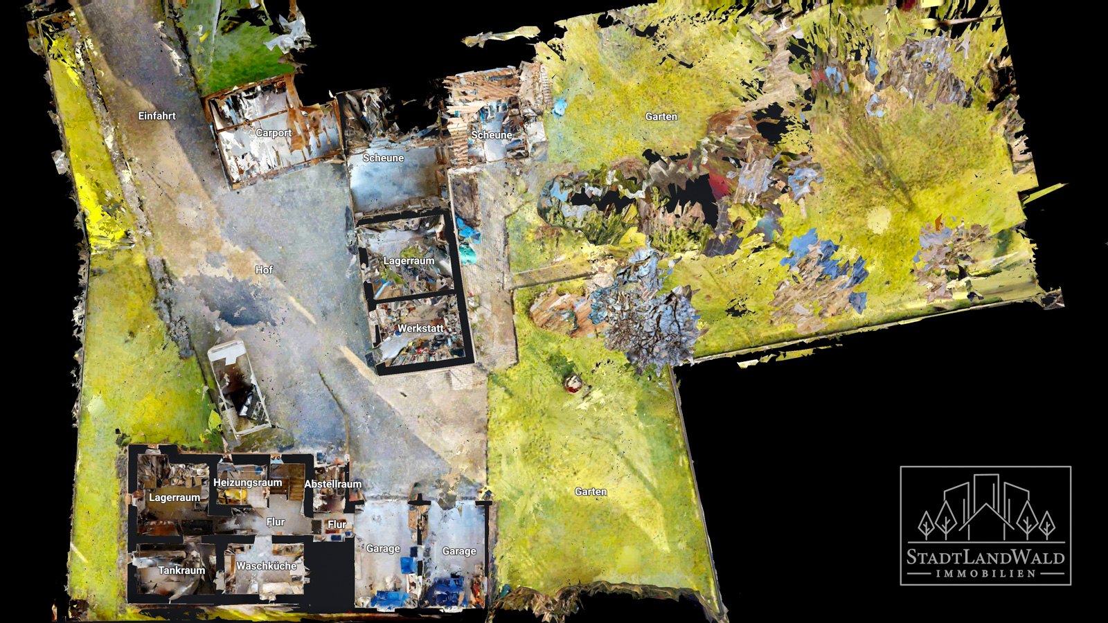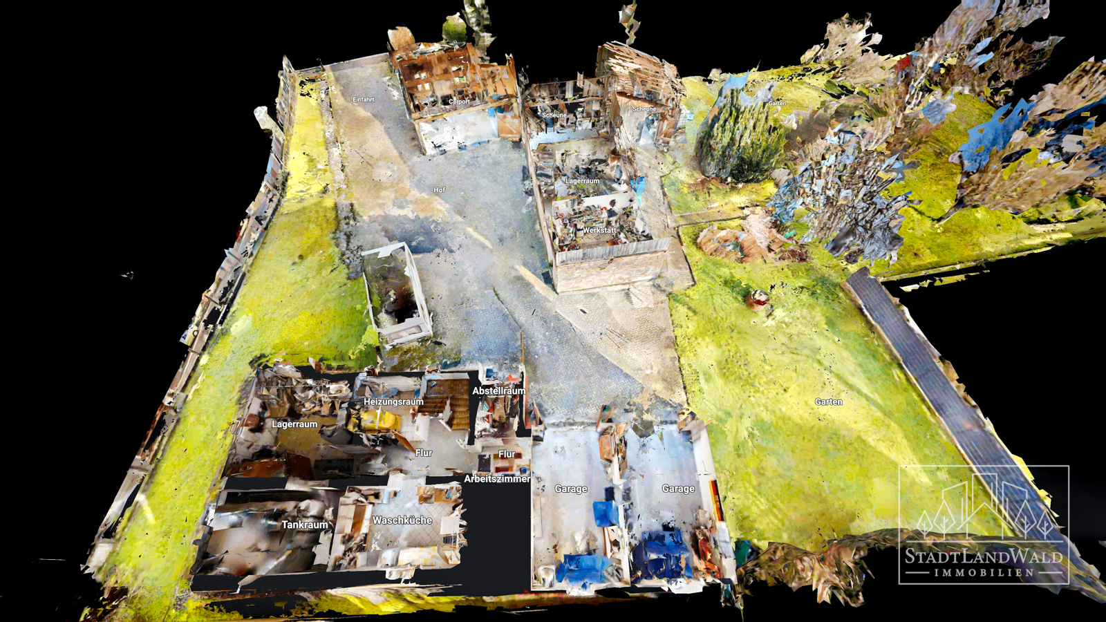 Flur | Heizraum mit Toilette | Lagerraum | Tankraum mit 4x 2.000 Liter Öltanks | Waschküche | Abstellraum | Arbeitszimmer | Garage mit Durchgang zur zweiten Garage | Garage | große Scheune mit insgesamt 4 Räumen | Carport